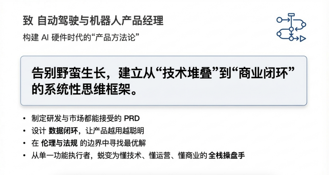 “作为自动驾驶或机器人领域的 PM,你是否常常感到自己在‘走钢丝’?左手是还未完全成熟的前沿技术,右手是极其严苛的安全与体验要求,中间还要面对商业化的巨大压力。这是一个没有现成教科书的岗位。