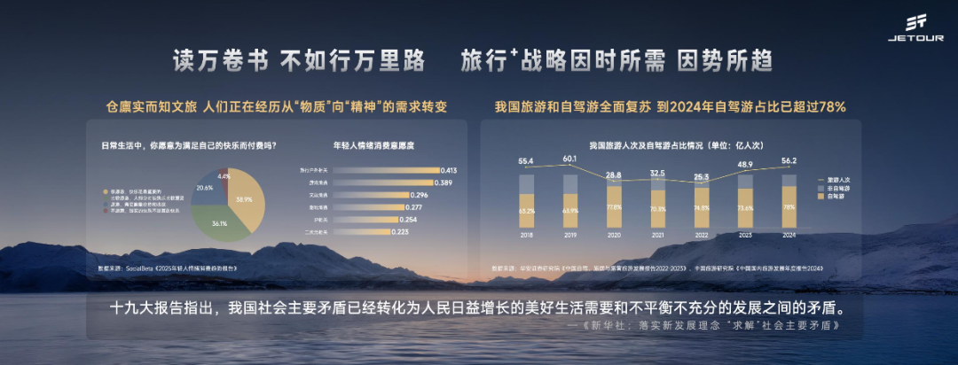 汽车产业的价值跃迁,从来都是对时代需求的精准回应。在国民从“物质满足”迈向“精神向往”的转型期,78%的旅行选择自驾,旅行已成为主流情绪出口。捷途的前瞻性在于,早在七年前便跳出“就车造车”的思维定式,笃定“旅行+”核心战略,完成从汽车制造商到“旅行生活服务商”的系统性升维。
