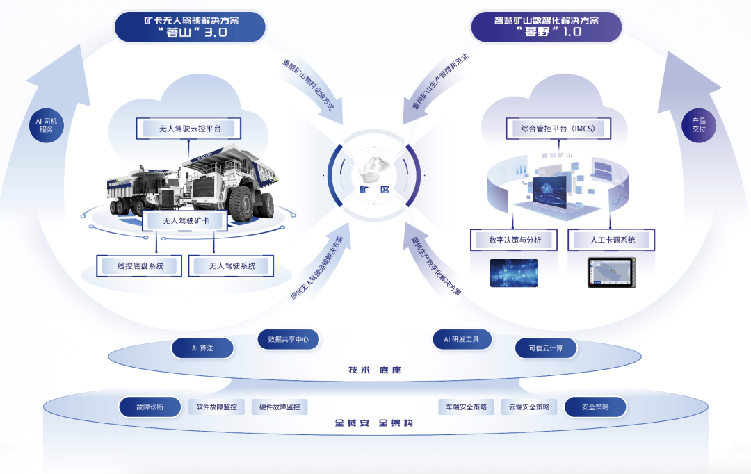2025年6月,易控智驾发布新一代矿卡无人驾驶解决方案“著山3.0”,该系统以全域安全为基座、AI技术为核心,通过多模态融合感知与多线程决策规划,实现矿山运输的无人化、高安全与高效率;随后发布的智慧矿山数字化平台“暮野1.0”,进一步提升了无人设备间的协同效率。