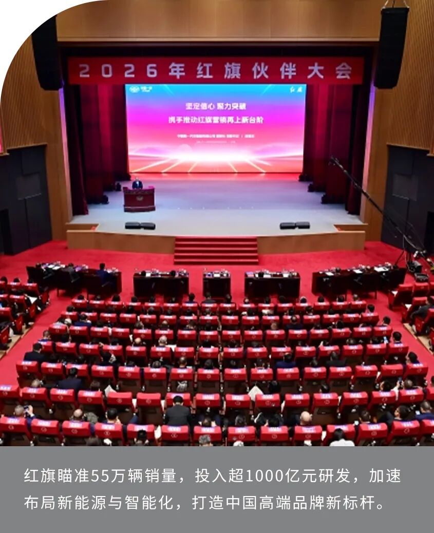 中国第一汽车集团有限公司董事长、党委书记邱现东以“信心”为核心关键词,向全场红旗伙伴掷地有声地宣告:2026年红旗品牌销量目标锁定55万辆,未来5年将投入大量研发资金,密集投放约30款新产品。