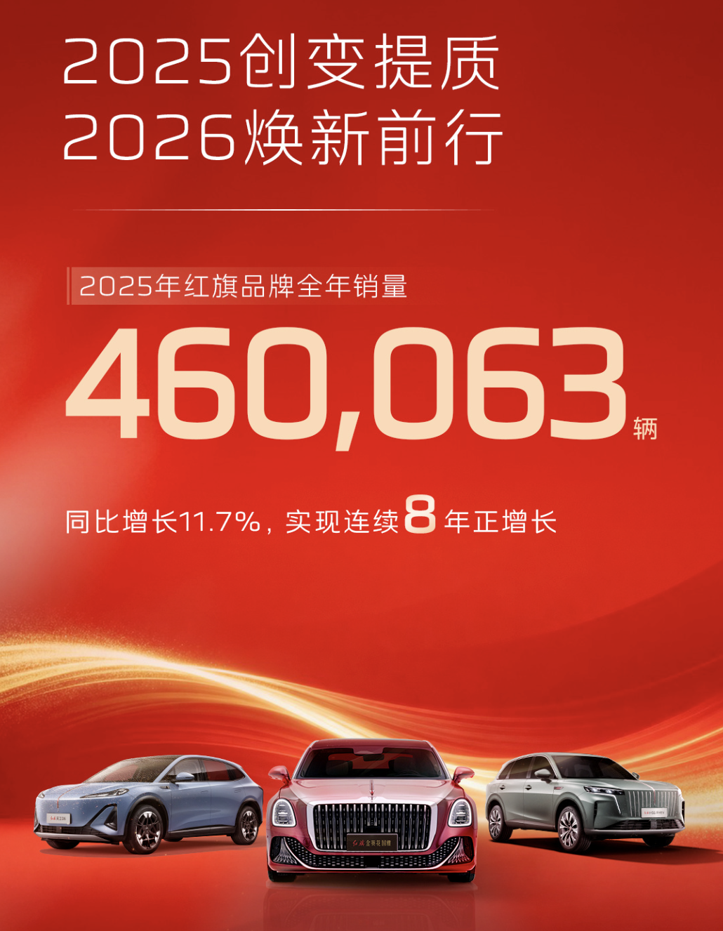 2025年,中国一汽整体销量逆势突破330万辆,同比增长3.2%,经营质量稳居行业第一梯队。作为集团核心增长引擎,红旗品牌更实现了连续8年正增长的行业纪录,全年销量突破46万辆,再创历史新高。