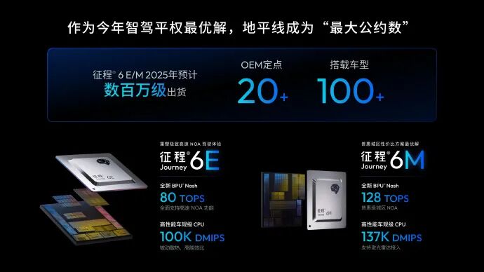 征程6E/M面向中阶辅助驾驶市场,已获得超20家车企及品牌合作,搭载超100款车型,2025年出货量预计达数百万级。
