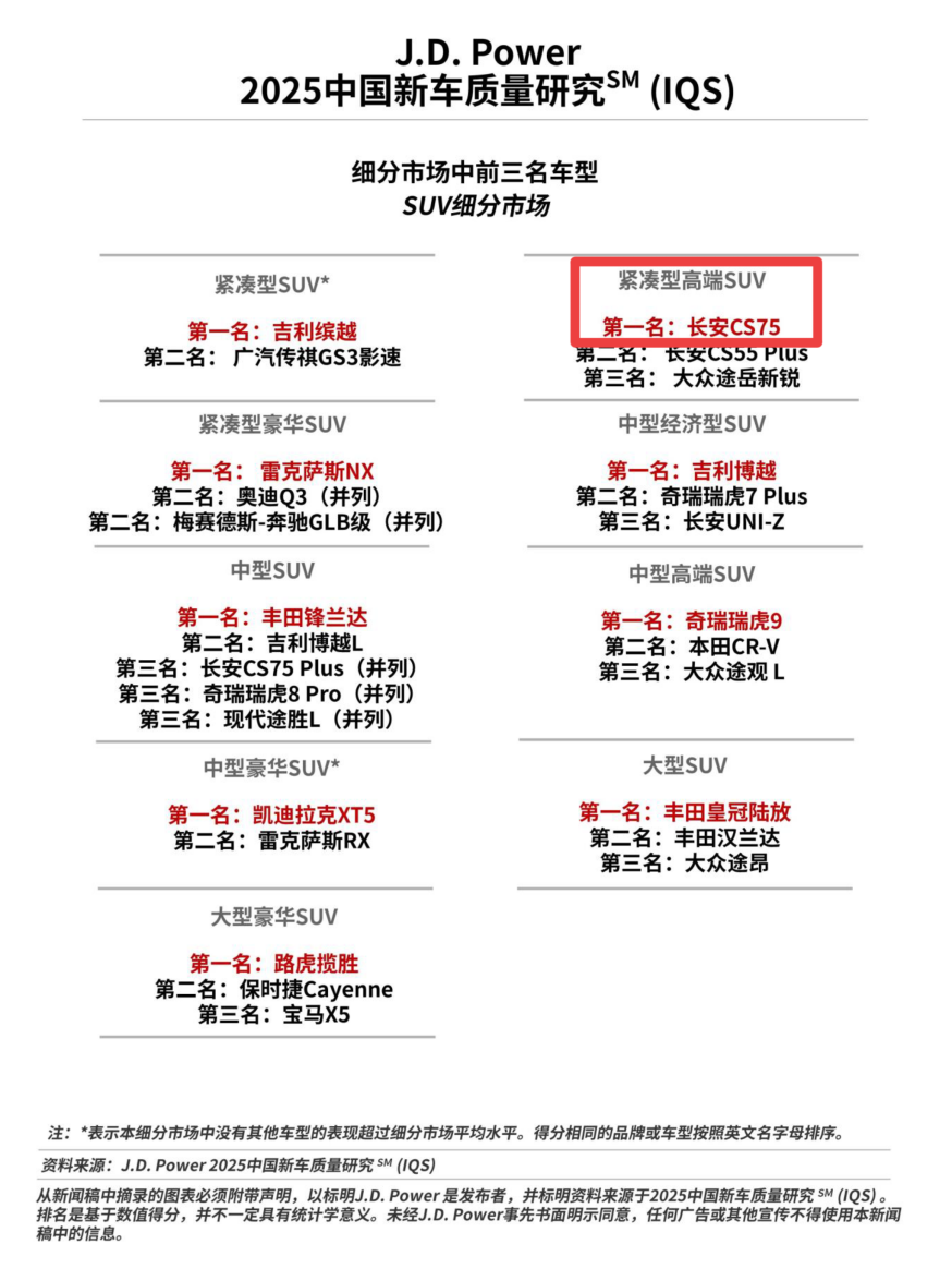 这种“靠得住”也有数据支撑。在J.D. Power 2025中国新车质量研究(IQS)中,长安CS75获得了紧凑型高端SUV第一名。这项基于数万名真实车主反馈的第三方权威调研,直观反映出车辆在用车初期的品质表现与用户体验,也诠释了长安CS75系列为何能长期稳居市场前列。