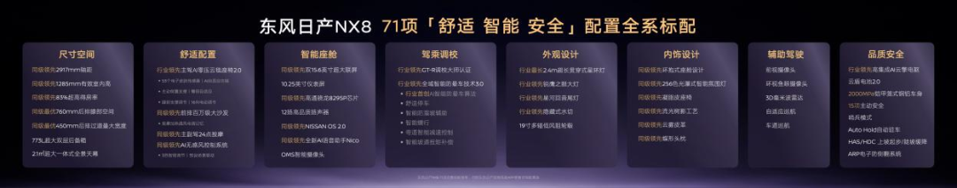 如果说外观是东风日产NX8的第一张名片,那么内饰、智驾、动力与安全的全面发力,就是它打动家庭用户的核心底气。不同于同级车型「减配入门版」的套路,东风日产NX8全系标配71项高价值配置,从内饰质感、智能体验,到空间舒适、动力安全,每一处都做到了顶格水准,真正实现了「入门即满配」,让每个版本的用户都能享受到同等的高品质体验。