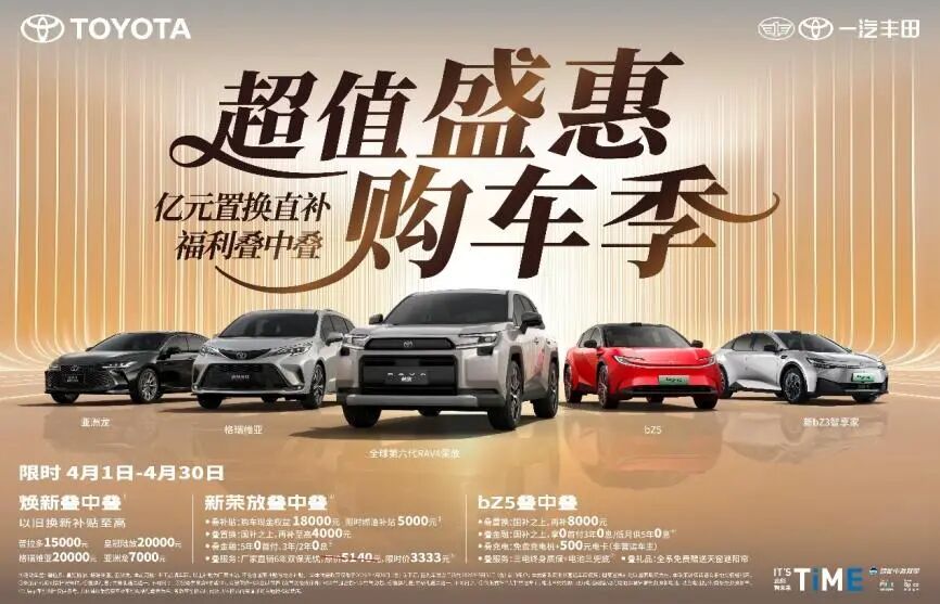 所以每逢踏青季这种全家出行的节点,当人们开始计较空间够不够大、路上安不安全、回来后养车省不省心的时候,一汽丰田几款车自然就浮上了水面。而这次品牌显然也拿出了诚意,用真金白银的置换补贴和限时权益,把换车门槛实实在在地往下拉了一截。