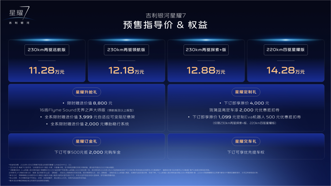 更关键的是,这一切,都建立在11.28万起的预售价格之上。吉利还同步给出了四重限时预售权益,全系赠送自适应可变阻尼悬架和爆胎稳行系统,高配车型还送16扬大师版音响,综合至高可享18799元的权益,把价值感直接拉满。