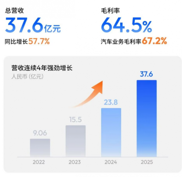 先看收入层面,2025年地平线营收达37.6亿元,同比增长57.7%,毛利24.26亿元,同比增长31.7%。营收和毛利双增长,代表着公司顺利地完成了市场扩张,将之前的智驾定点转化成真正的量产交付收入。