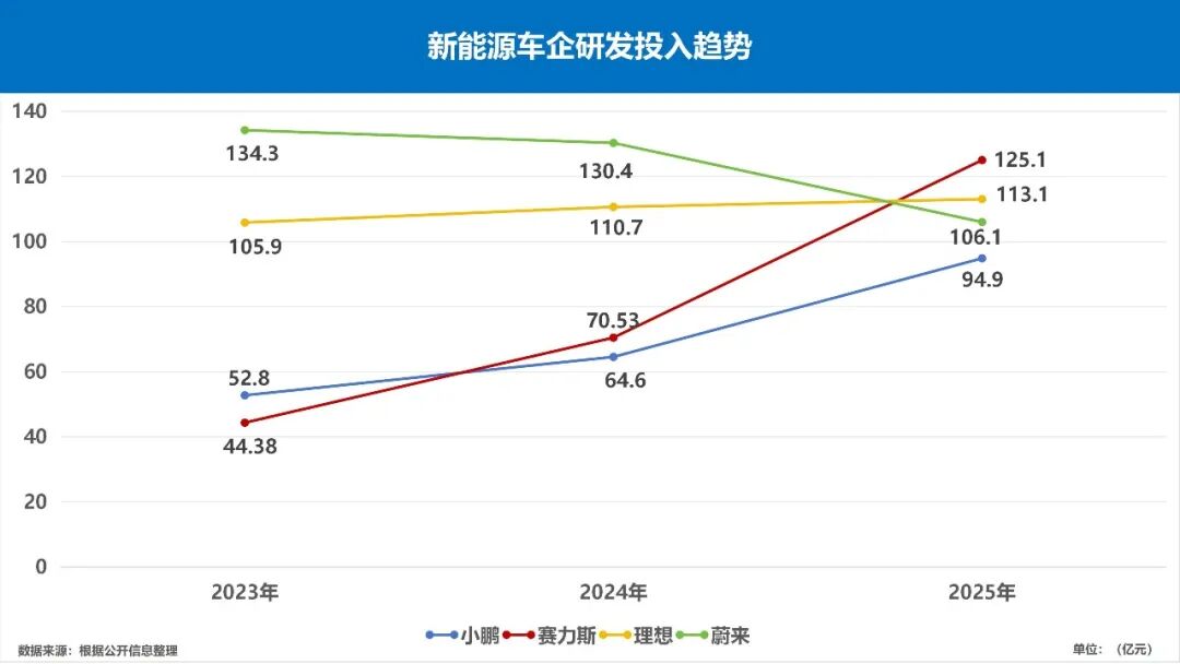 2024年,赛力斯研发投入70.53亿元,2025年猛增至125.1亿元。横向对比,这个体量已经超过理想(113.1亿)、蔚来(106.1亿)、小鹏(94.9亿),在新势力中排名第一。