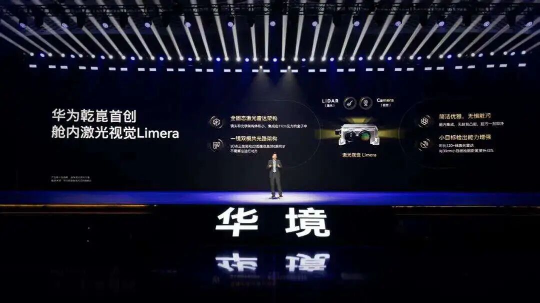 值得注意的是,华境S上搭载的华为乾崑智驾ADS Pro增强版,不是目前华为顶尖的896线双光路激光雷达,而是华为首创的舱内视觉激光雷达Limera,硬件配置为1颗舱内固态激光视觉、3颗4D毫米波雷达、11颗高清摄像头及12颗超声波雷达。