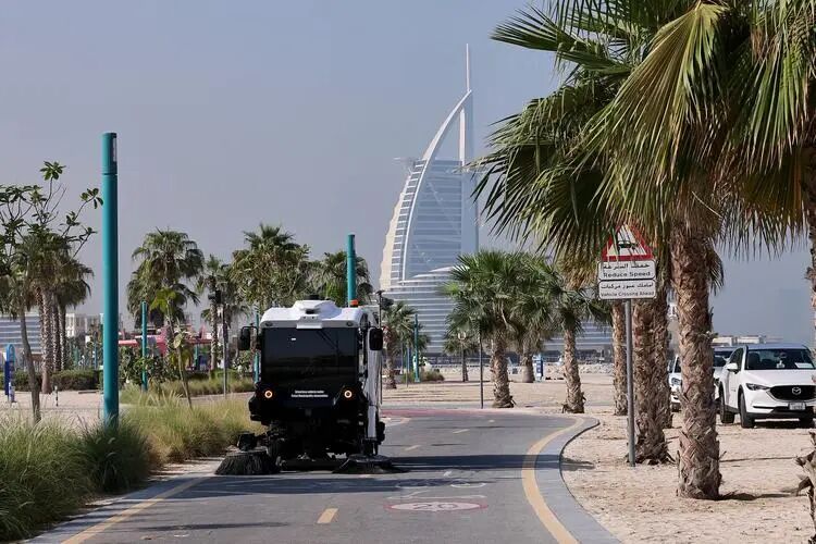 迪拜朱美拉海滩,地表温度51℃,一台白色无人环卫车缓缓滑过帆船酒店前的步道,顺手把游客洒落的椰枣核扫进分类垃圾箱。