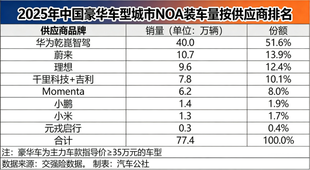 因此,城市NOA的龙头企业,也就扮演了智能化乃至整个汽车产业发展的火车头角色。根据汽车公社基于交强险数据整理,华为乾崑智驾ADS在2025年以74.5万辆的成绩,继续蝉联城市NOA市场冠军,占据约28%市场份额。