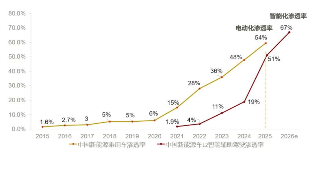 回顾汽车整个辅助驾驶的发展,实际上发展历史长度不如新能源车,但增速是新能源车的2倍:实现50%的渗透率,电动化用了10年,而智能化仅用了5年。L2智能辅助驾驶渗透率将在2026年超过电动化渗透率。