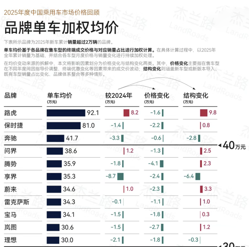 报告显示:2025年问界的单车成交均价攀升至38.6万元,比上年提升了1.2万元。更关键的是,问界在品牌单车成交均价榜单中位列第四名,同时又斩获了新能源汽车品牌成交均价第一名。