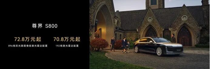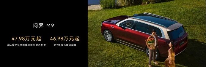 搭载192线激光雷达的尊界S800和问界M9,起售价则是70.8万元和46.98万元——这意味着,这一激光雷达及其带来的提升,分别加价2万元和1万元。