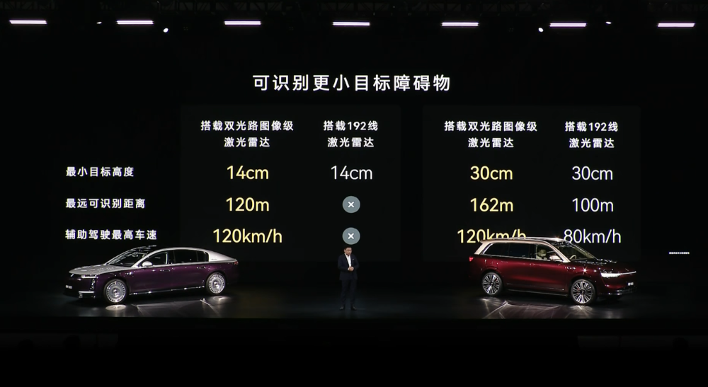 而30cm的物体可以最远在162米就能识别到,为高速行车提供长达3秒的提前预警,还能做到舒适避让或刹停,避让速度也从80km/h提升到了120km/h。相比于现款尊界S800 搭载的192线激光雷达,仅能在时速80km/h能识别100米左右的30cm障碍物。
