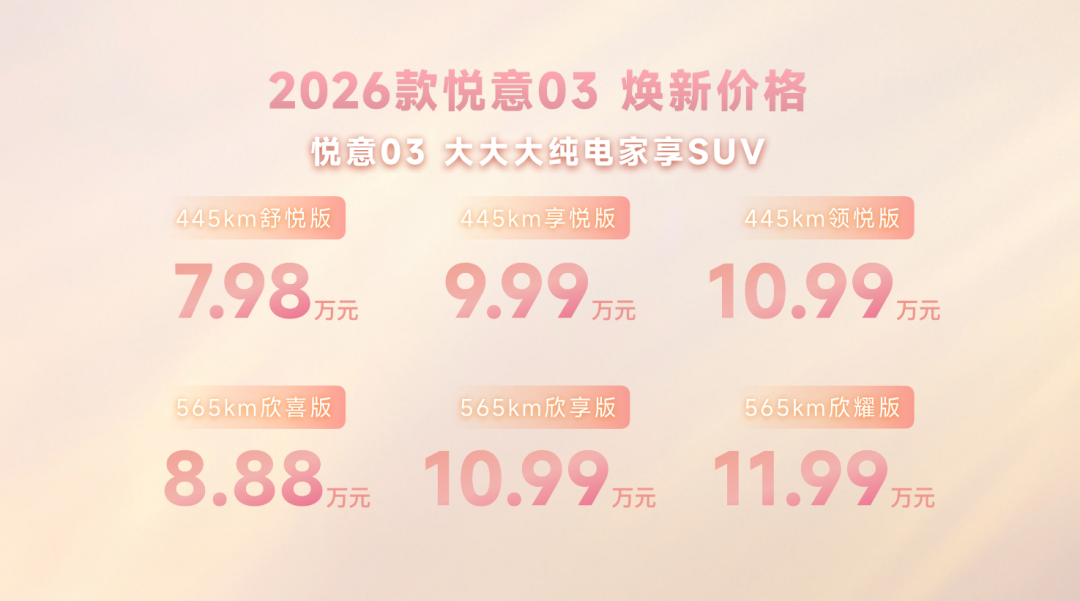 3月8日妇女节,实力演员张若昀直播助阵,“大大大纯电家享SUV”焕新而来,2026款悦意03挚爱上市,为每一位女神献上春天的礼物。445km、565km两种续航共计6款车型,官方售价7.98-11.99万元。围绕年轻小家庭,尤其是家庭女性用户的进阶需求,从颜色推新到舒适满配,2026款悦意03带来全新晨晖金车色、晨曦白内饰色等20余项升级,让用车更舒心、开车更省心、养车更安心,正如张若昀所说:“悦意03是真舒适的纯电SUV。”当前购车还可享7年0息贷款、无门槛整车及三电终身质保等丰富权益,轻松开启高品质纯电生活。