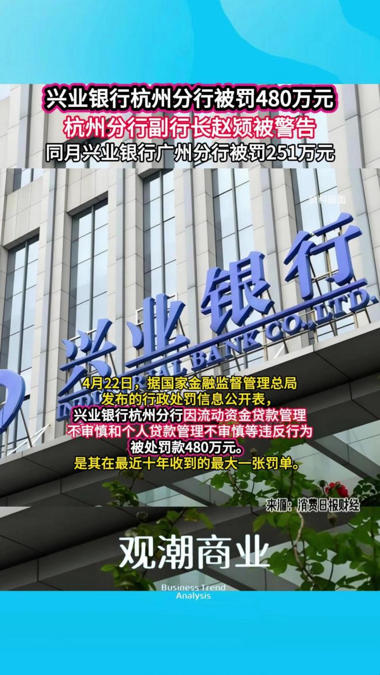 兴业银行杭州分行被罚480万元,分行副行长赵颎被警告,同月兴业银行广州分行被罚251万元