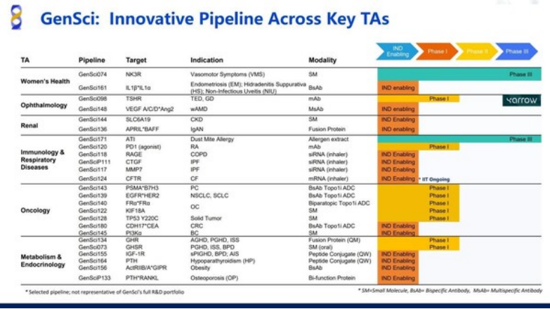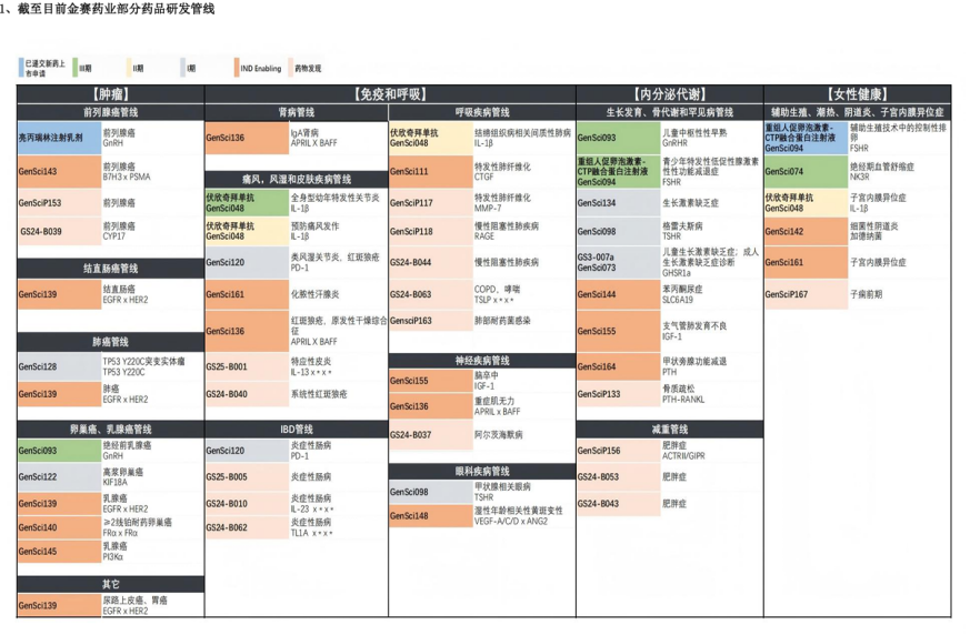 女性健康领域,目前该公司已有多款产品上市,包括重组人促卵泡激素注射液(金赛恒®)、黄体酮注射液(II)(金赛欣®)等,同时还有多条在研管线,如治疗血管舒缩症(潮热,VMS)的神经激肽3受体(NK3R)拮抗剂GenSci074、适用于细菌性阴道炎(BV)治疗的GenSci142等。