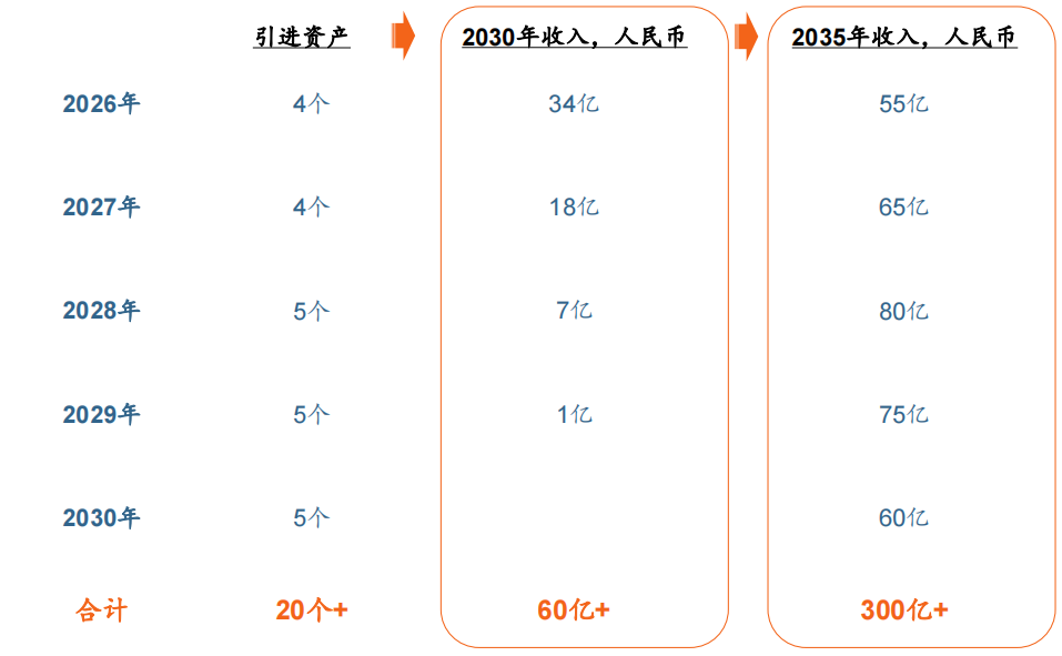未来,云顶新耀的核心任务之一,便是将这套成熟的商业化能力复制至更多产品领域。根据“2030战略”规划,公司将通过BD引进模式,每年补充3-5款重磅中后期资产;到2030年,力争实现整体收入规模超150亿元,其中现有管线贡献约90亿元收入,新引进管线贡献约60亿元收入,并探索潜在对外授权(License-out)收入;年复合增长率预计在2025-2030年超过50%,2030年后保持超过15%。