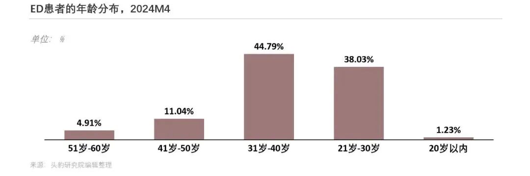 一个显著的转变是:面对过去的“难言之隐”,公众健康观念已从“被动就医”转向“主动消费”,核心驱动力正是消费群体年轻化。《2024年中国抗ED药物行业白皮书》显示,21~30岁年轻患者占比已达38.03%。这一群体更看重生活品质,愿意为即时效果、隐私保护和购药便捷性付费,直接推动了ED领域从治疗需求向日常消费需求转变。