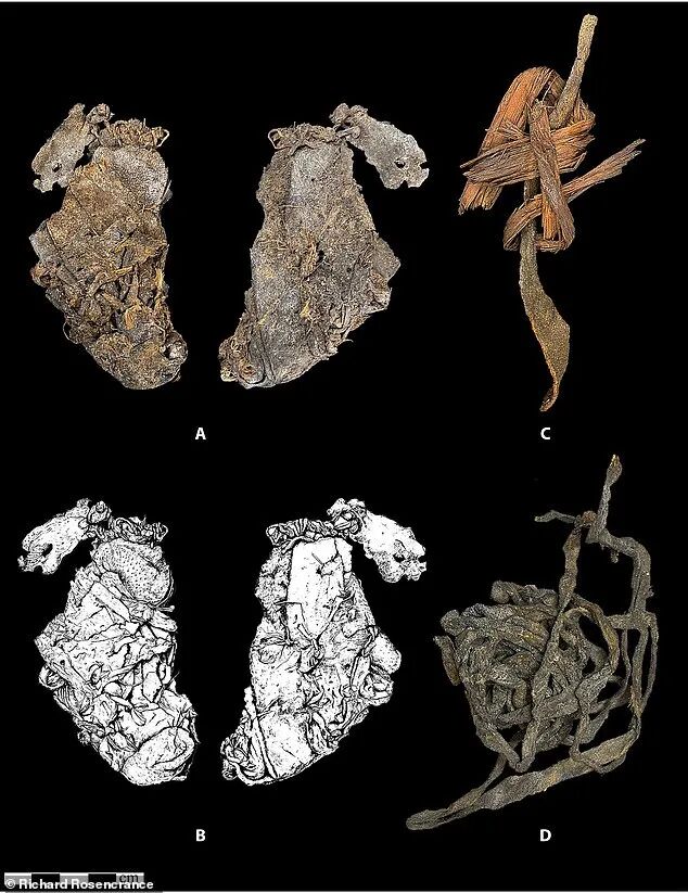 麋鹿皮缝制件:清理过毛发,用植物纤维+动物毛缝成,可能是紧身外套、鞋子或袋子——这是目前已知最老的缝制兽皮;