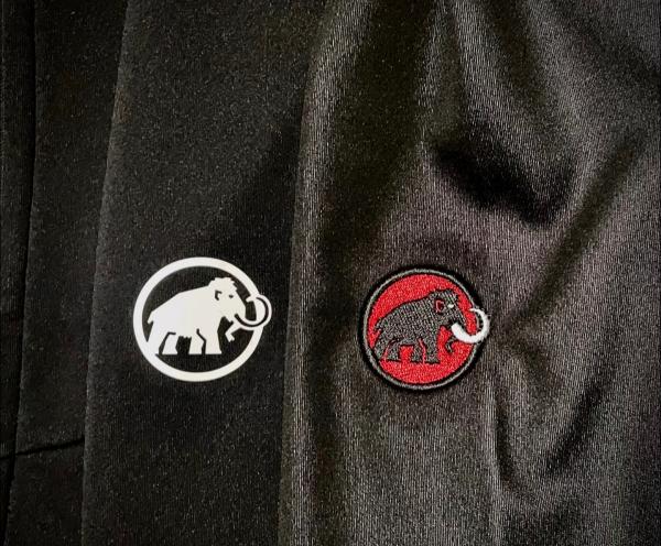 所谓的猛犸象红标、白标,是品牌logo的两种展现形式,其中红标是刺绣logo,红背景、黑象身、白象牙;白标则属于压胶logo,胶印部分为白象身、黑象牙。