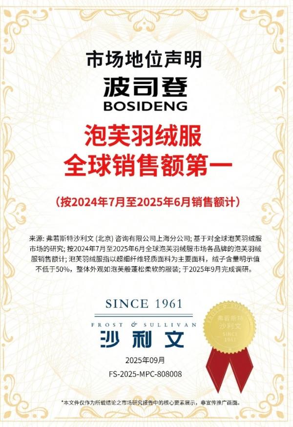根据沙利文今年发布的报告,截至2025年6月底的过去一年,波司登作为产品的首创者,泡芙羽绒服全球销售额第一。