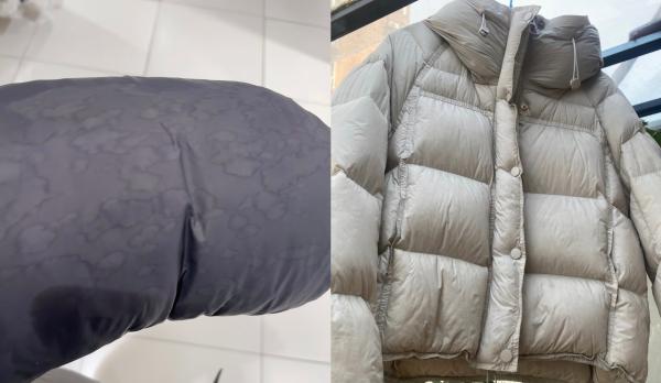 还有网友洗过一次之后,发现衣服上不仅留下了水印,面料还会变得皱皱巴巴,原本蓬松挺拔的羽绒服,就像是泄了气的皮球。