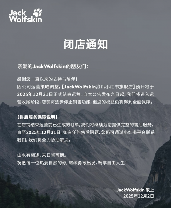 德国户外品牌Jack Wolfskin(狼爪)于近日宣布,出于成本考量的运营战略调整,将于年底正式关闭其小红书官方旗舰店。此举在其母公司安踏引发了剧烈回响。渠道试错的表象下,狼爪的闭店更像一道精准的探照灯,照亮了安踏千亿光环背后日益凸显的“消化不良”症状。