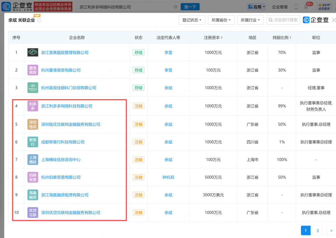 利多多的实控人余斌,旗下关联公司高达17家,其中除了医美机构、眼科医院仍在营外,大部分公司名称中涉及助贷、贷款咨询等业务的公司已被注销,余斌的职务基本上是执行董事、实控人等核心职务。