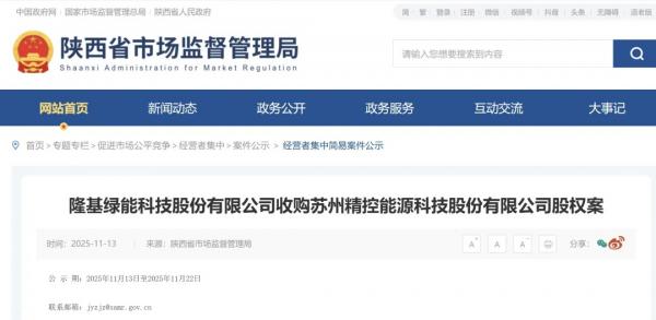 13天前,陕西省市场监督管理局网站公示《隆基绿能科技股份有限公司收购苏州精控能源科技股份有限公司股权案》。