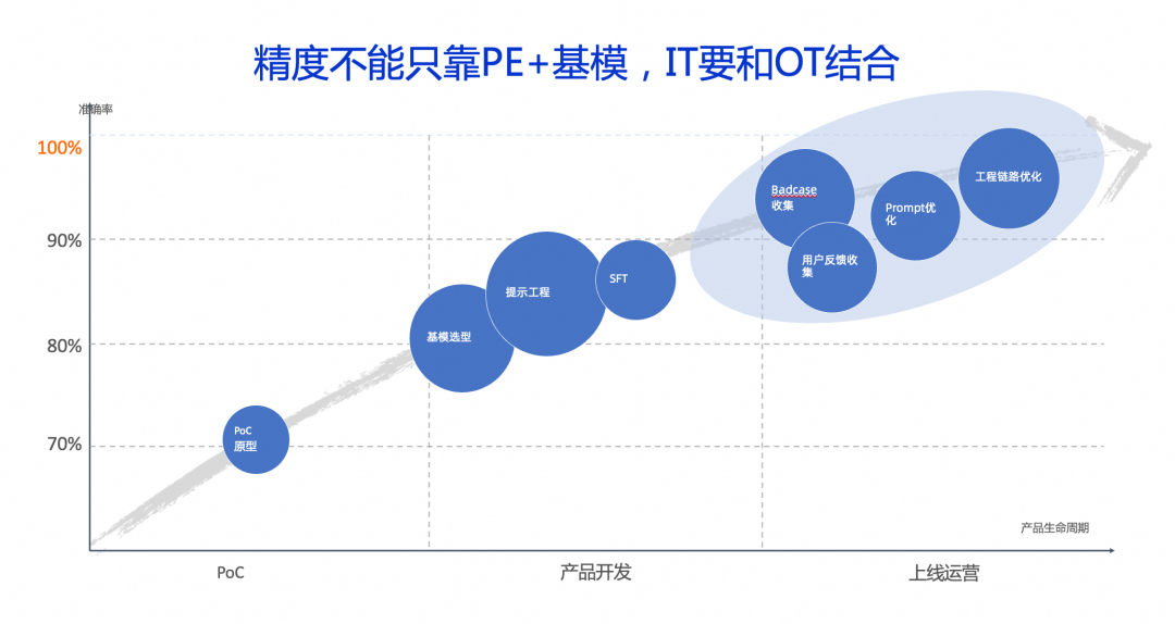 最后,我想想概要讲讲精度与业务效果控制。很多人觉得大模型Agent就是一个Prompt,我就是不断选择最好的模型,改出最好的提示词,注入经验和行业SOP做最好的Agent架构,智能体一上线就万事大吉,我个人的观点,大模型本身也是一个技术,也是属于IT的范畴,一定要和运营OT进行结合,最终效果往往是需要IT和OT两面一起合力,不能单纯只依赖一个优秀的Prompt和选取一个好的模型来处理,还是要多结合很多东西。
