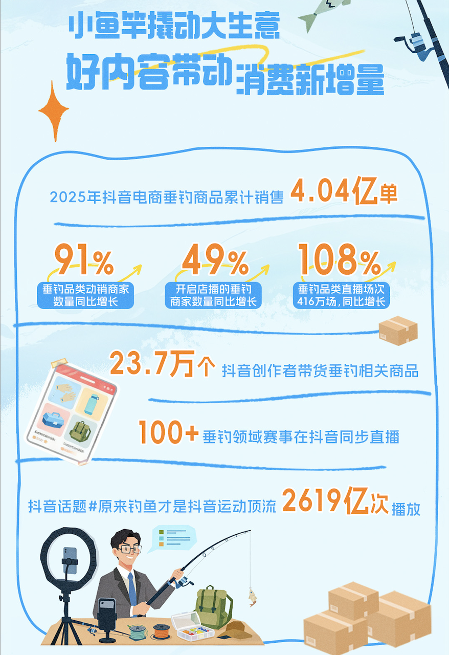 一个趋势是:越来越多的钓鱼佬习惯在抖音下单。《2025年抖音电商垂钓消费趋势报告》显示,这一年中,垂钓类商品累计售出4.04亿单,垂钓品类动销商家数量同比增长91%。同时,店播成为垂钓商家的普遍选择:开启店播的垂钓商家数量在2025年同比增长49%,垂钓品类直播场次同比增长108%。