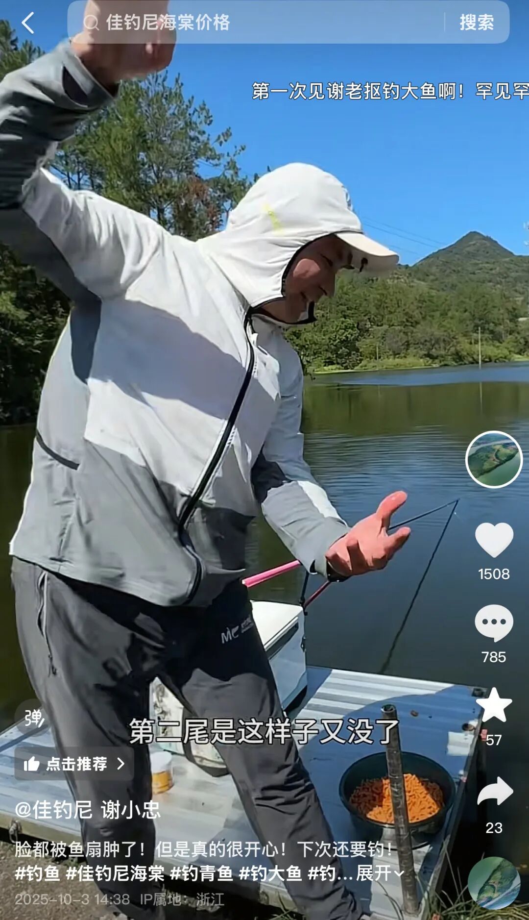 很多活跃在抖音的年轻钓鱼佬,本身也是内容创作者——以及天然的产品推销员。谢小忠记得,有用户购买佳钓尼的溪流竿后,跑到黄山脚下钓到了马口鱼,拍成高质量的视频内容,在抖音发布时还艾特了佳钓尼官方,形成互动。在抖音平台,他们的内容可以被更多人看到,帮品牌实现自然获客,并形成循环。