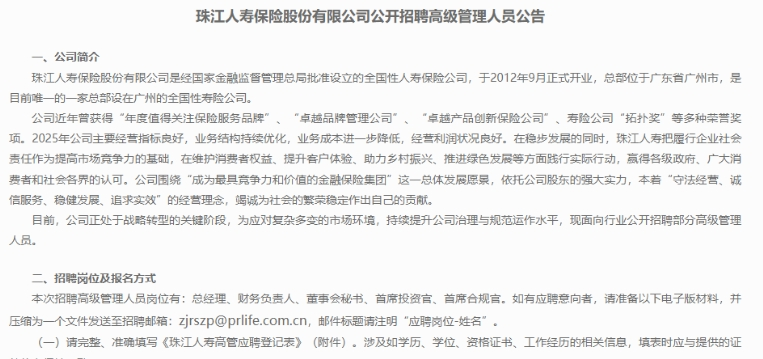 2025年12月,珠江人寿通过网络平台公开发布信息,招聘总经理、财务负责人、首席投资官等高管。在中国保险业,一次性公开招募包括总经理在内的五名核心高管,实属罕见。