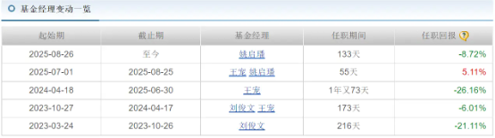 现任基金经理姚启璠2025年7月上任,资历尚浅,投资经验刚满半年,目前回报-8.72%。