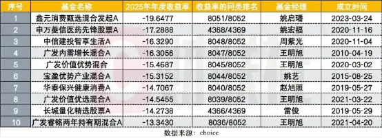 Choice数据显示,2025年,鑫元消费甄选在主动权益基金中亏损幅度最大,年内A/C份额净值均跌近20%,在同类排名中分列最后两位。