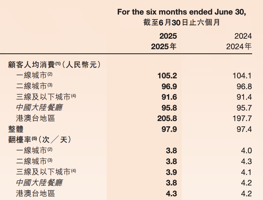 其中,2025年上半年在一线城市、二线城市、三线及以下城市的翻台率分别为3.8次、3.8次、3.9次,同比分别减少0.2个百分点、0.5个百分点、0.2个百分点。