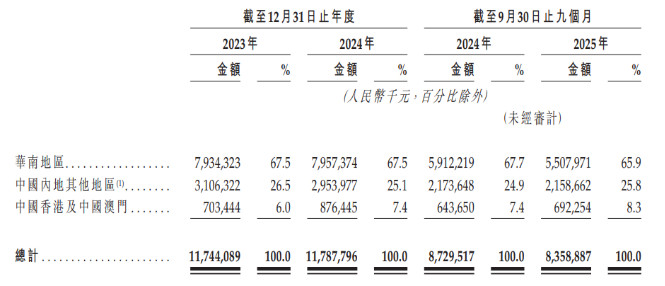 不过华南地区的门店总量近年增长缓慢,2024年较上年同期小幅增长了12家,2025年1至9月净减少了15家,同期公司来自华南地区的收入也同比下降约6.83%至55.08亿元。