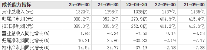 业绩层面来看,2025年第三季度,浦发银行实现营收417.2亿元,同比增长0.31%;归母净利润90.82亿元,同比增长10.29%。前三季度,公司实现营收1323亿元,同比增长1.88%;归母净利润388.2亿元,同比增长10.21%。