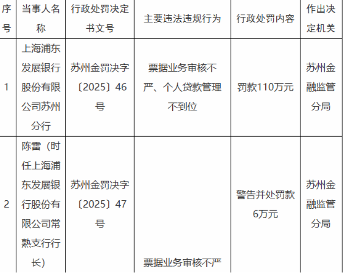 1月5日,国家金融监督管理总局苏州监管分局发布的行政处罚信息显示,上海浦东发展银行苏州分行,因票据业务审核不严、个人贷款管理不到位,被罚款110万元。