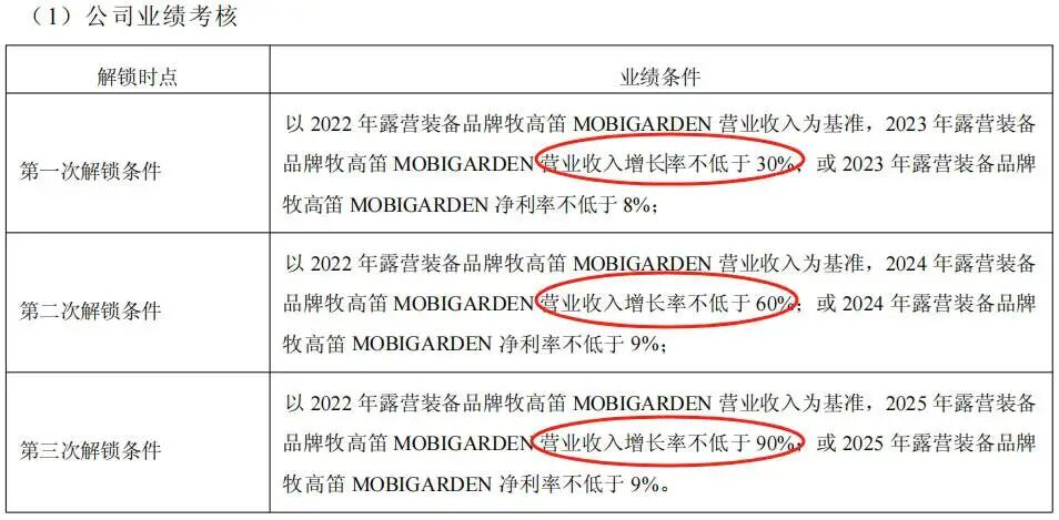 2023年8月,牧高笛推出员工持股计划,解锁条件为2023-2025年露营装备品牌收入较2022年增长不低于30%/60%/90%,或净利率不低于8%/9%/9%。