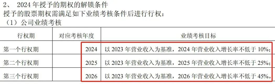 2024年,公司又授予员工股票期权,解锁条件以2023年业绩为基数,要求2024年增长不低于10%、2025年增长不低于25%、2026年增长不低于45%等。