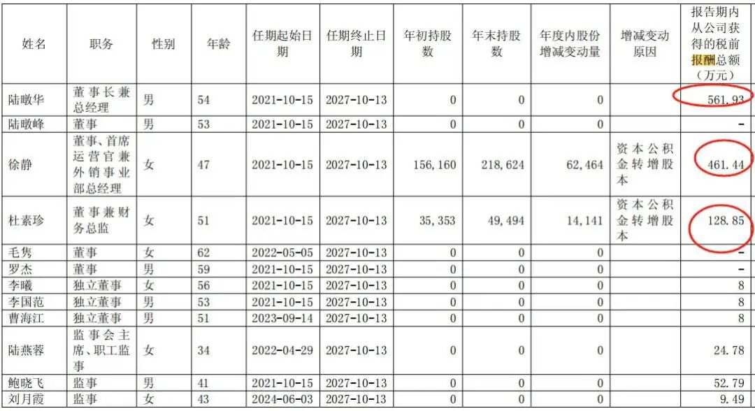 从薪酬变化来看,核心高管是涨薪主力,尤其是董事长兼总经理的陆暾华,三年间报酬从72万元跃升至561.93万元,一己之力成为高管层薪酬增长的绝对主力。
