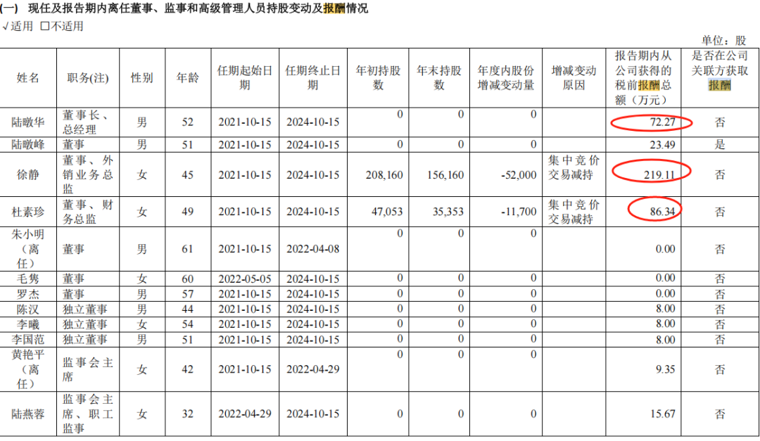 2022年,董事长陆暾华报酬总额72.27万元,董事徐静219.11万元,董事兼财务总监杜素珍86.34万元,制造总监马其刚116.52万元,高管层合计薪酬671.83万元。