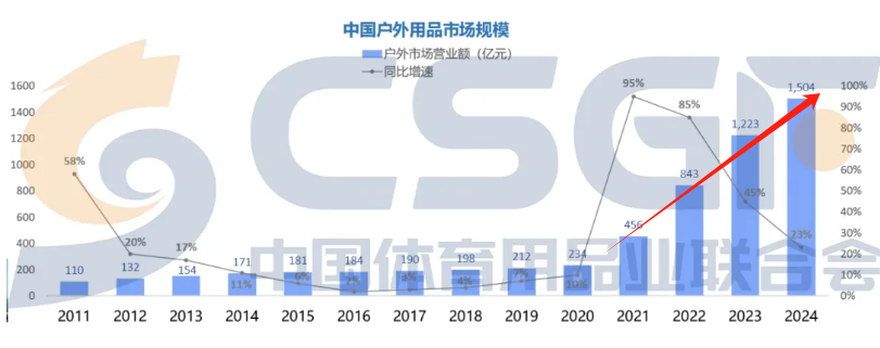 此外,中国体育用品业联合会户外产业专业委员会发布的《中国户外市场报告》显示,2024年户外市场规模突破1504亿元,同比增速高达23%。