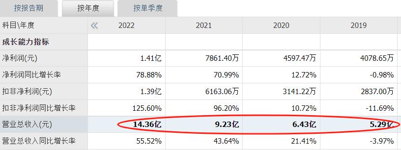 2019-2022年,牧高笛营业收入实现爆发式增长,分别达到5.29亿元、6.43亿元、9.23亿元、14.36亿元。净利润方面,2022年更是创下1.41亿元的峰值。