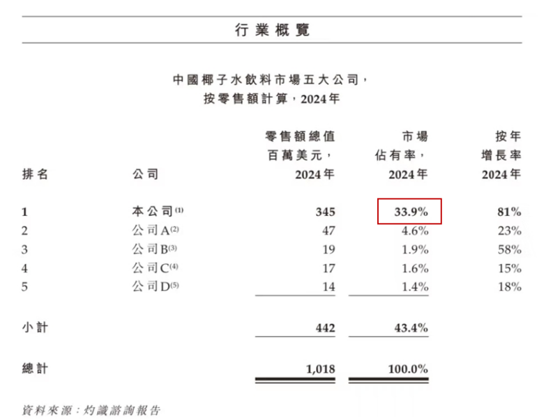 彼时,资本市场为其描绘的蓝图是:中国内地椰子水市场连续五年的“销冠”、全球第二大椰子水企业、仅靠46名员工创造超11亿元营收的“轻资产神话”。