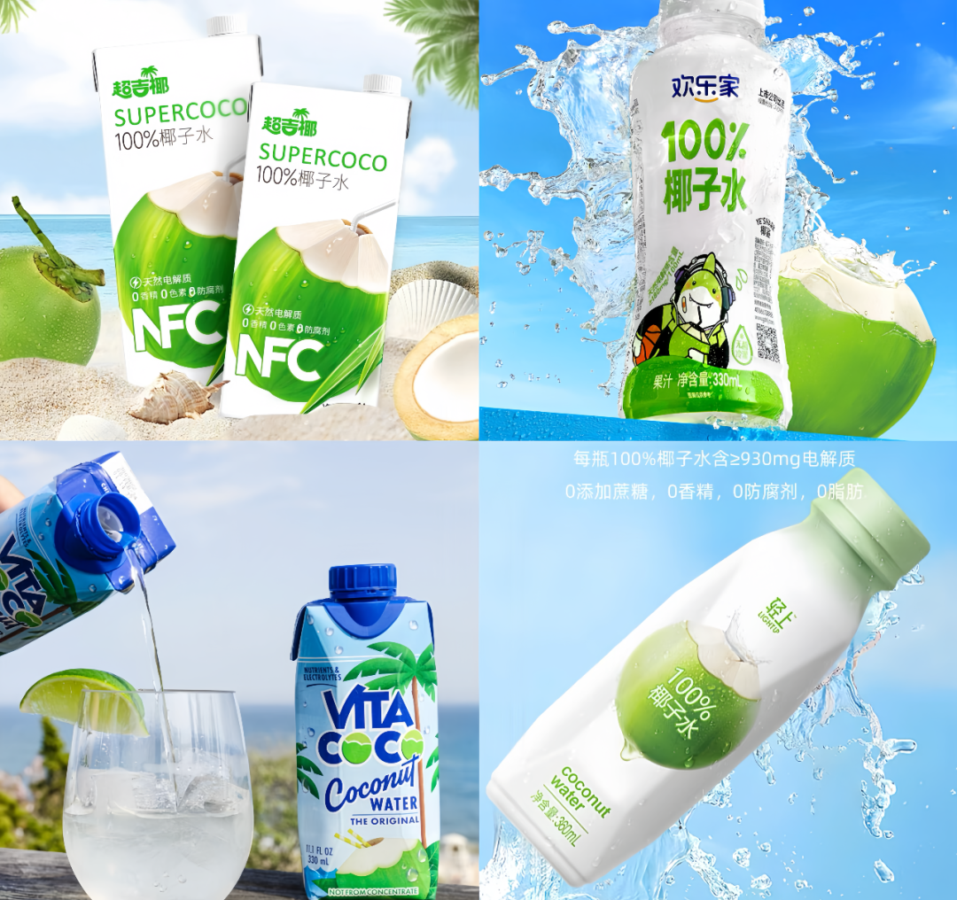 随着椰子水市场热度持续攀升,“百椰大战”正式开启,市场竞争进入白热化阶段。超吉椰、欢乐家等本土品牌快速崛起,VitaCoco、轻上等同赛道竞争者则采取低价策略抢占份额。