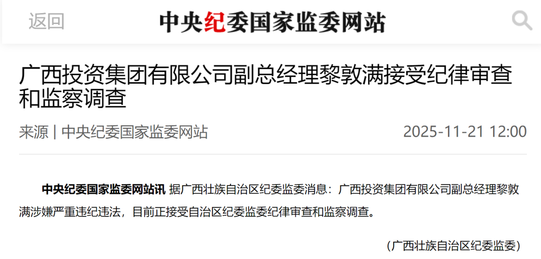 就在今年11月21日,广西投资集团有限公司副总经理黎敦满涉嫌严重违纪违法,任上被查。黎敦满的另一个重要身份,是柳州银行的前任董事长。